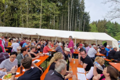 Aber zurück zum eigentlichen Grund dieser Übung: Der 1. Mai 2024 ist angebrochen! Das Wetter ist herrlich! Es deutet sich an, dass Petrus an diesem Tag richtig gute Laune hat. Bereits am frühen Morgen erwacht das Leben am Rentnerplatz. Jedes Zahnrad greift ins andere, die Getränkelieferung inklusive der Bänke werden gewohnt zuverlässig angeliefert und in Windeseile abgeladen und aufgebaut. Die Ausstattung wird in die „Versorgungszelte“ verteilt. Die Organisation ist bemerkenswert. Jeder Grill, jede Kasse, jeder Kuchenteller, jedes Wasserfass und unzählige andere Dinge… Alles hat seinen Platz, seinen Stromanschluss, seinen Stuhl, … Ein großer Dank dafür an euch alle!