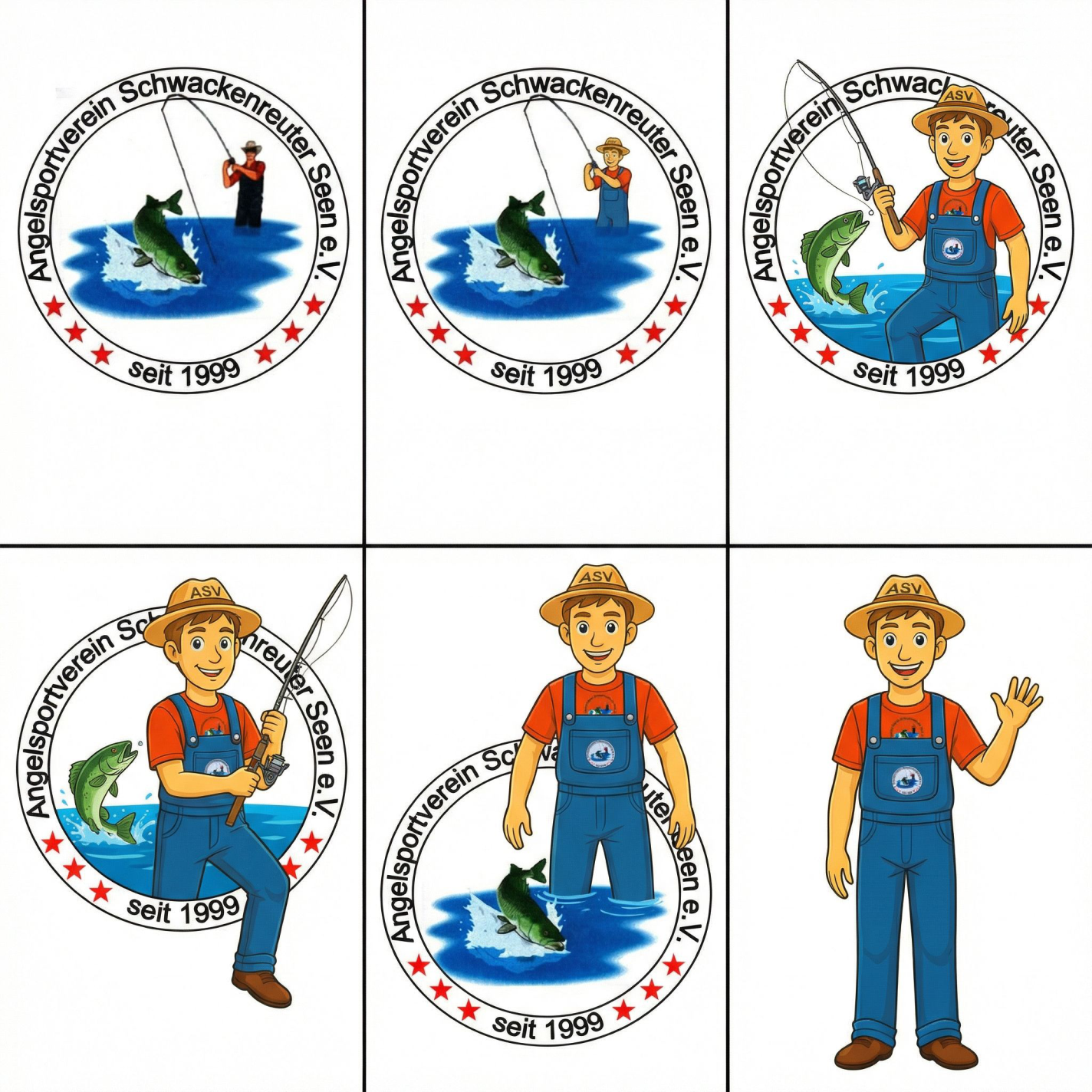 Ich bin direkt aus euerm Vereinswappen geklettert – mit ASV-Hut, rotem Shirt, blauer Latzhose und einem dicken Anglergrinsen im Gesicht! 🎣